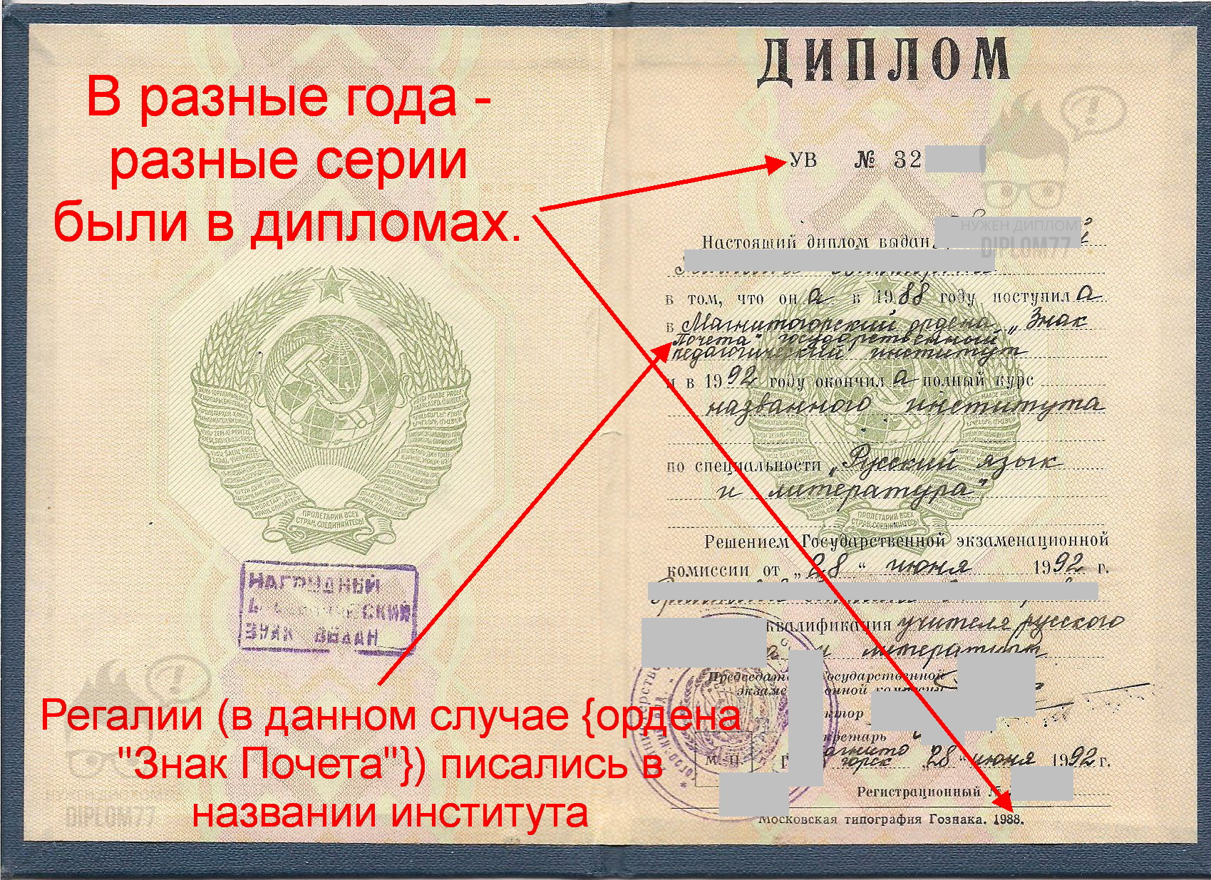 - Несмотря на принятие в 1993 году герба РФ, до 1995 года в бланках диплома использовали герб СССР;