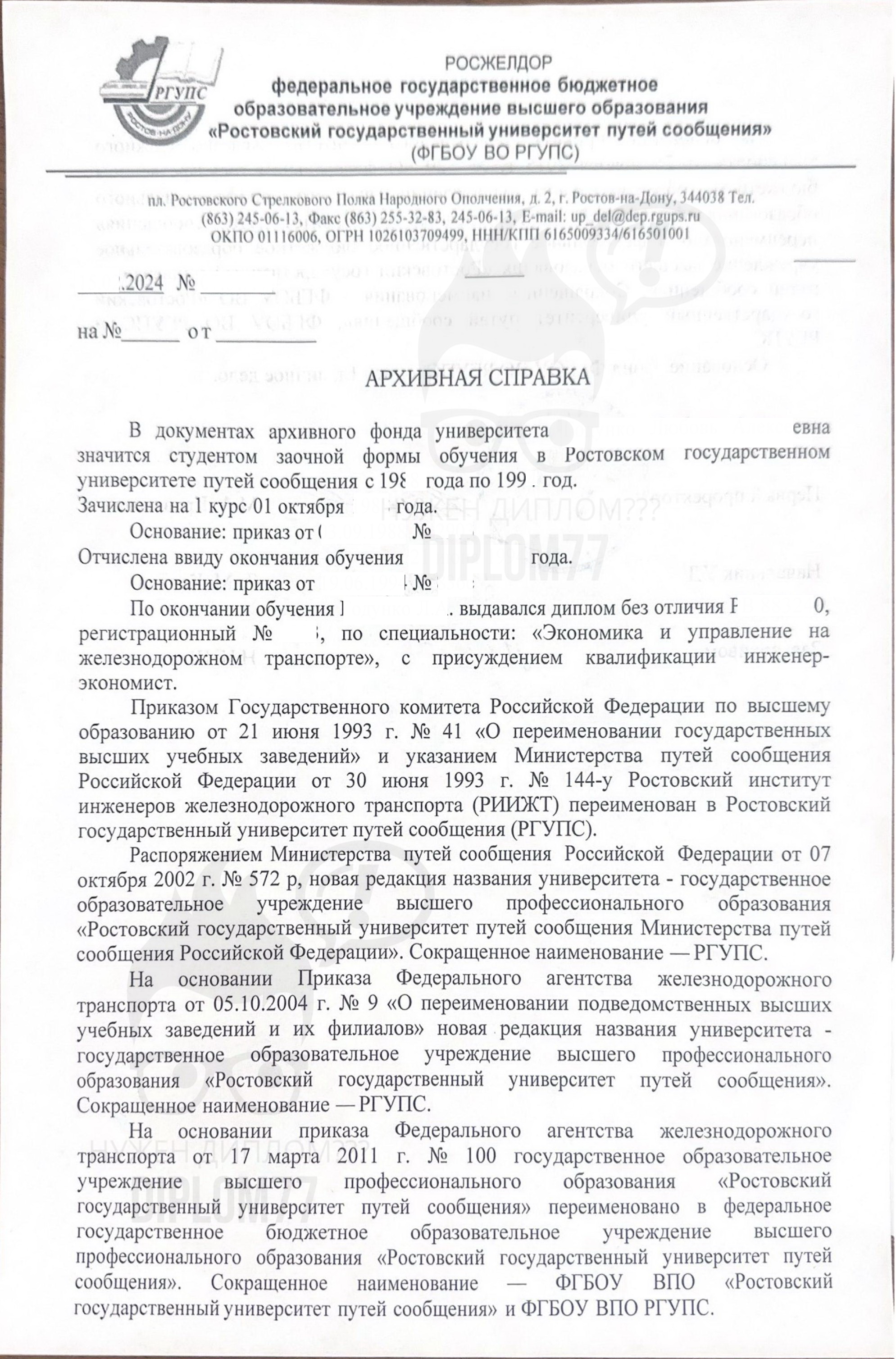 Ответ: А образец у вас есть? Или там обычную архивную справку надо сделать? Отправить информацию можно на WhatsApp +79052590480 или е-мейл zakaz@diplom77.com