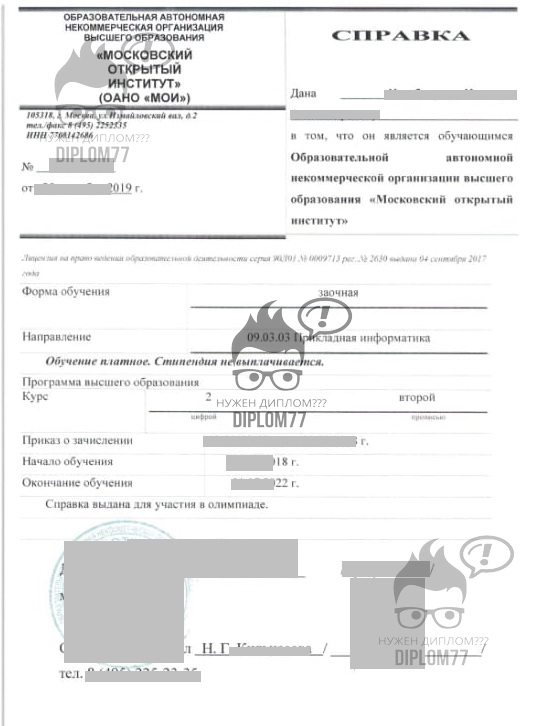 Вопрос: Здравствуйте Нужна справка с места учебы в ВУЗе на работу родителям. У вас можно купить справку любого ВУЗа Москвы или каких-то определенных ВУЗов? Можно заказать справку от даты 2020 и 2021 года (1 и 2 курс)? Спасибо