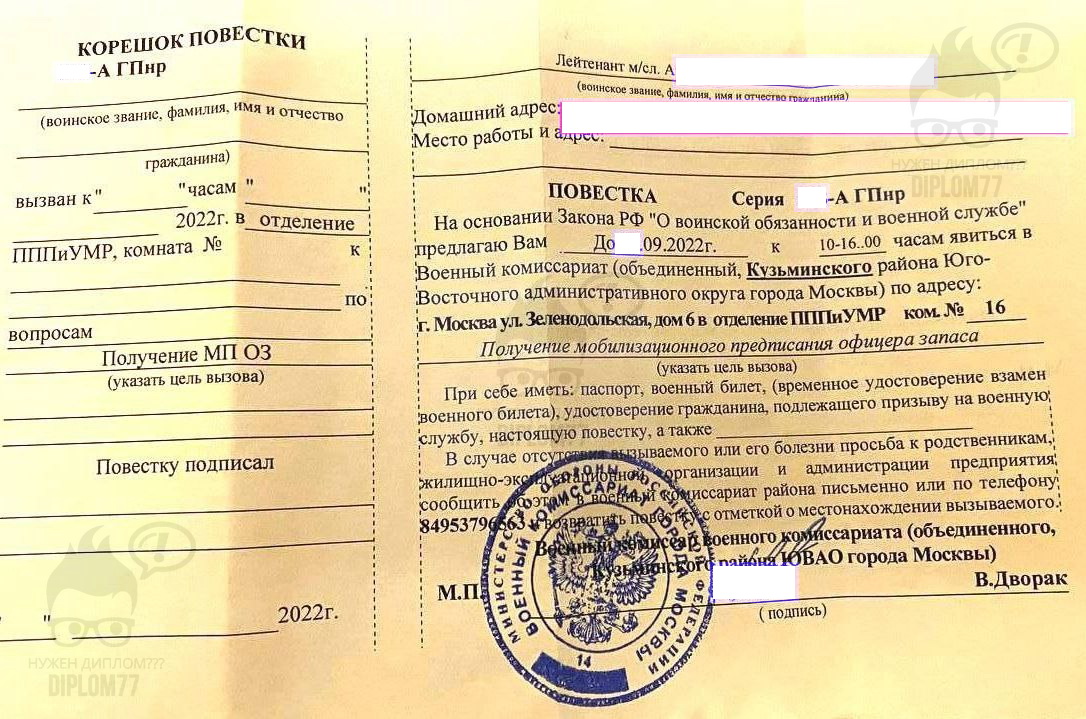 Ответ: Здравствуйте. Высылайте образец на WhatsApp +79052590480 или е-мейл zakaz@diplom77.com . Сделаем такую же повестку только на ваши данные. Стоить будет 10 000 рублей. Делается за 2-3 рабочих дня и плюс время доставки. Подробнее о вариантах оплаты и доставки здесь: https://d77x.cfd/dostavka