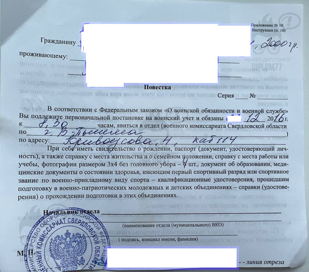 Вопрос: Нужна повестка в военкомат с печатью